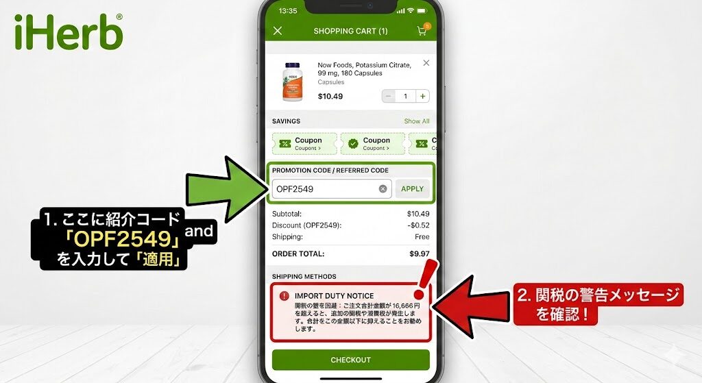 アイハーブでの買い物を常に最安値圏にするためには、チェックアウト時に紹介コード「OPF2549」を入力するのが鉄則です。