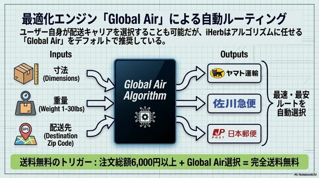 「Global Air」は、アイハーブが注文ごとにコストと効率を自動でシミュレーションし、最もスムーズに届けられる業者(主にヤマト運輸か佐川急便)を選んでくれるサービスです。