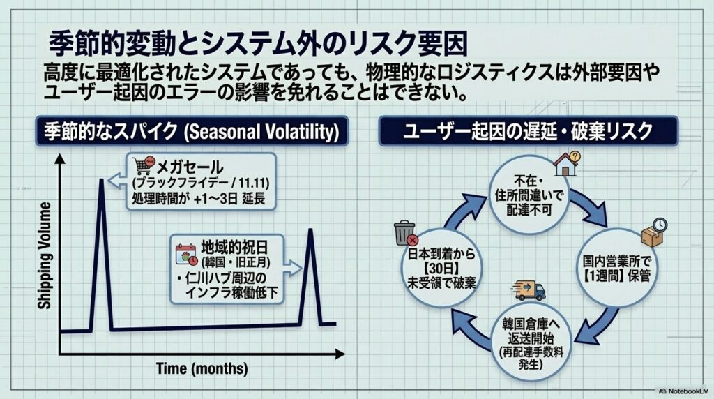 - 住所入力のミスや個人の自宅以外への配送指定は、大幅な遅延を招くリスクがある。