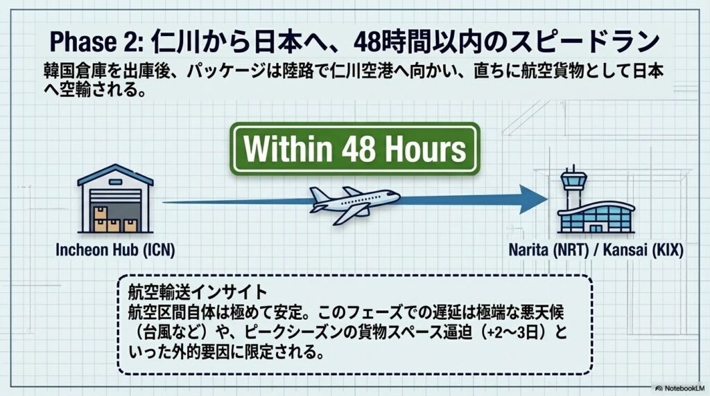 「出荷済」になった荷物は、韓国や香港の倉庫から飛行機で日本(成田や関空など)へ運ばれます。