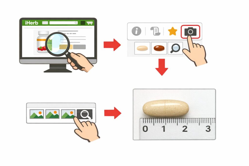 「届いてみたら飲み込めないほど巨大だった」という失敗を防ぐには、商品写真の最後にある「実寸大の粒と定規」の画像を必ず確認してください。